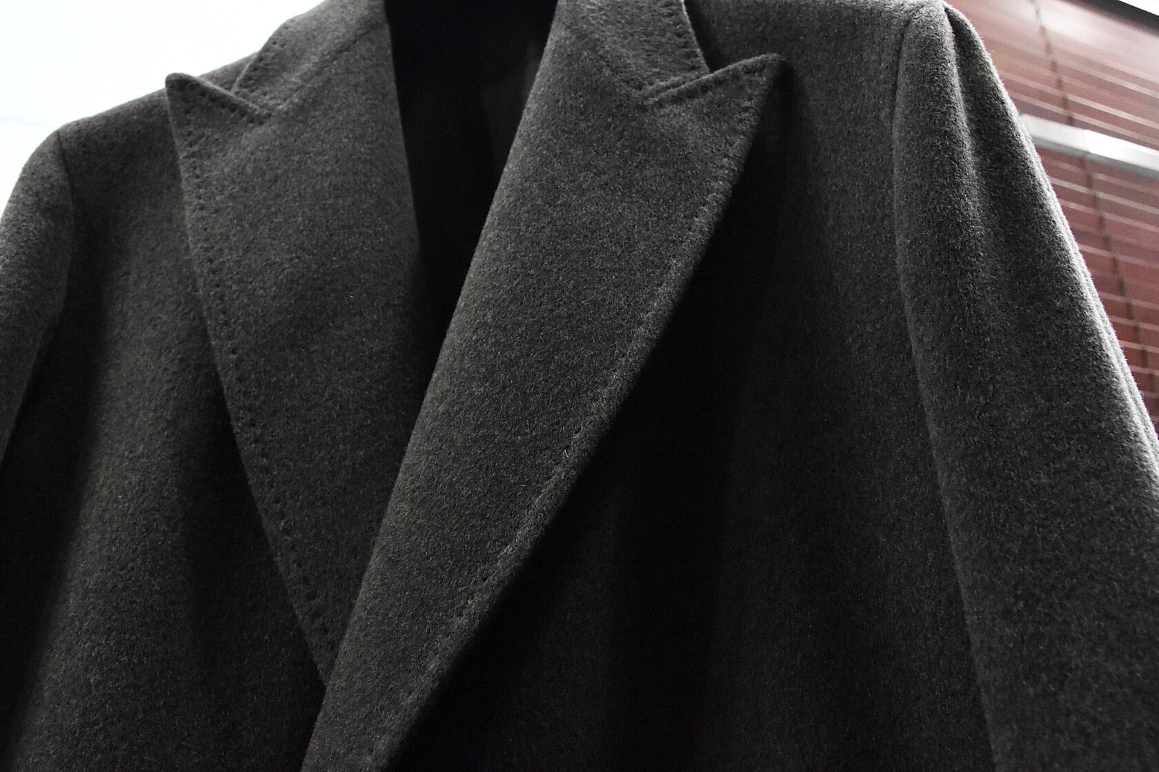 ショルダーはほんのり落ちたリラックス感あるライン。ドレスなムード漂うピークドラペル。またウエストシェイプがほとんど入れられていない膝丈くらいの程良くユルめなシルエットゆえ、カジュアル、ドレスどちらのスタイルも溶け込むコートに仕上がっています。昨年展開したBR別注の違いとして今シーズンは内掛けのボタンが一つ付けられているという点。ガウンのような雰囲気をダイレクトに活かしたデザインとなっています。