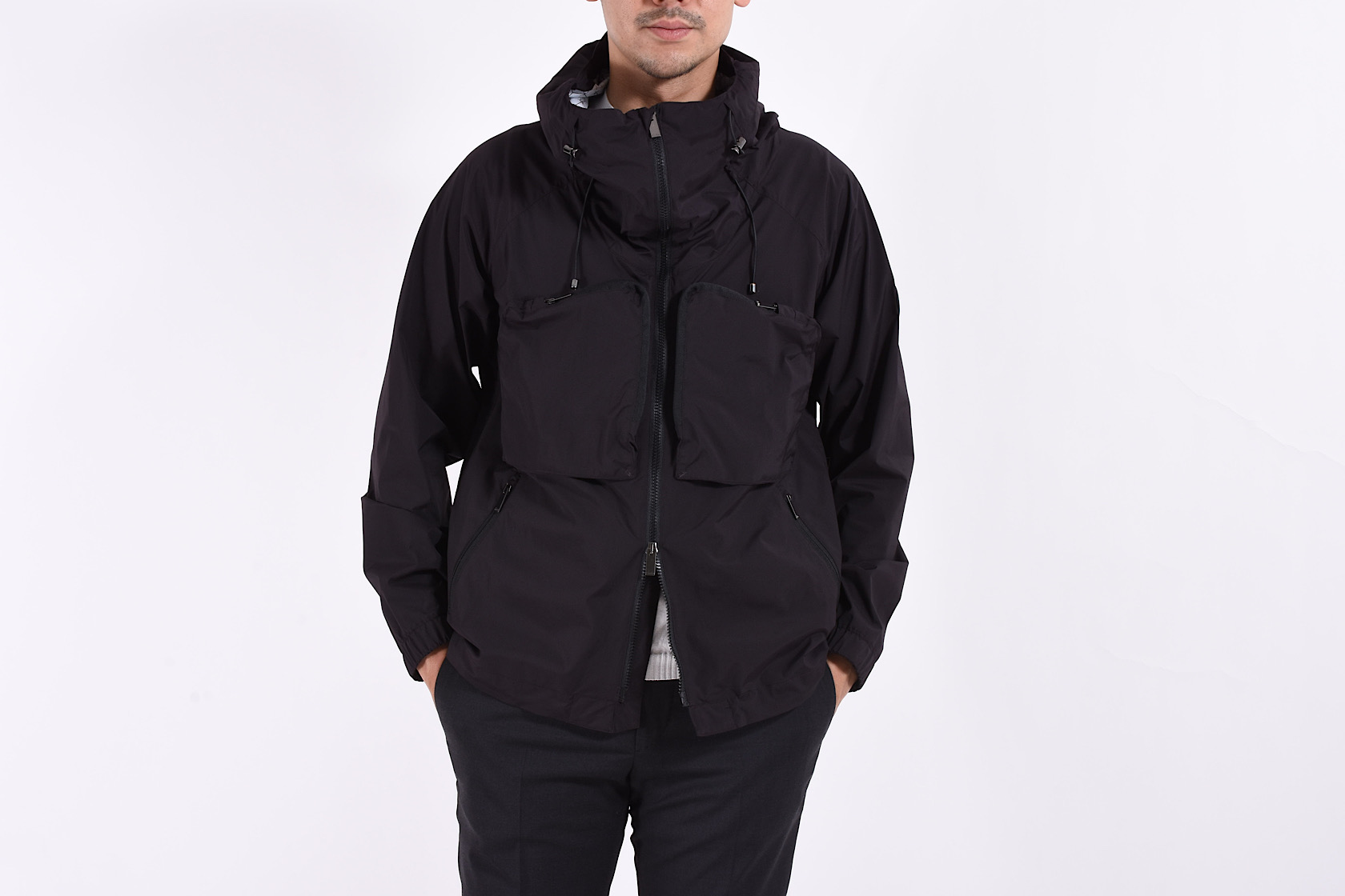 只ならぬオーラを放つ近未来感溢れるデザイン。高機能素材を使ったライトシェルブルゾンの登場です。一番に目を引くのはマチ付きの大きな胸ポケット。更に左袖に配されたブランドロゴがスポーティでモードな雰囲気を醸します。
