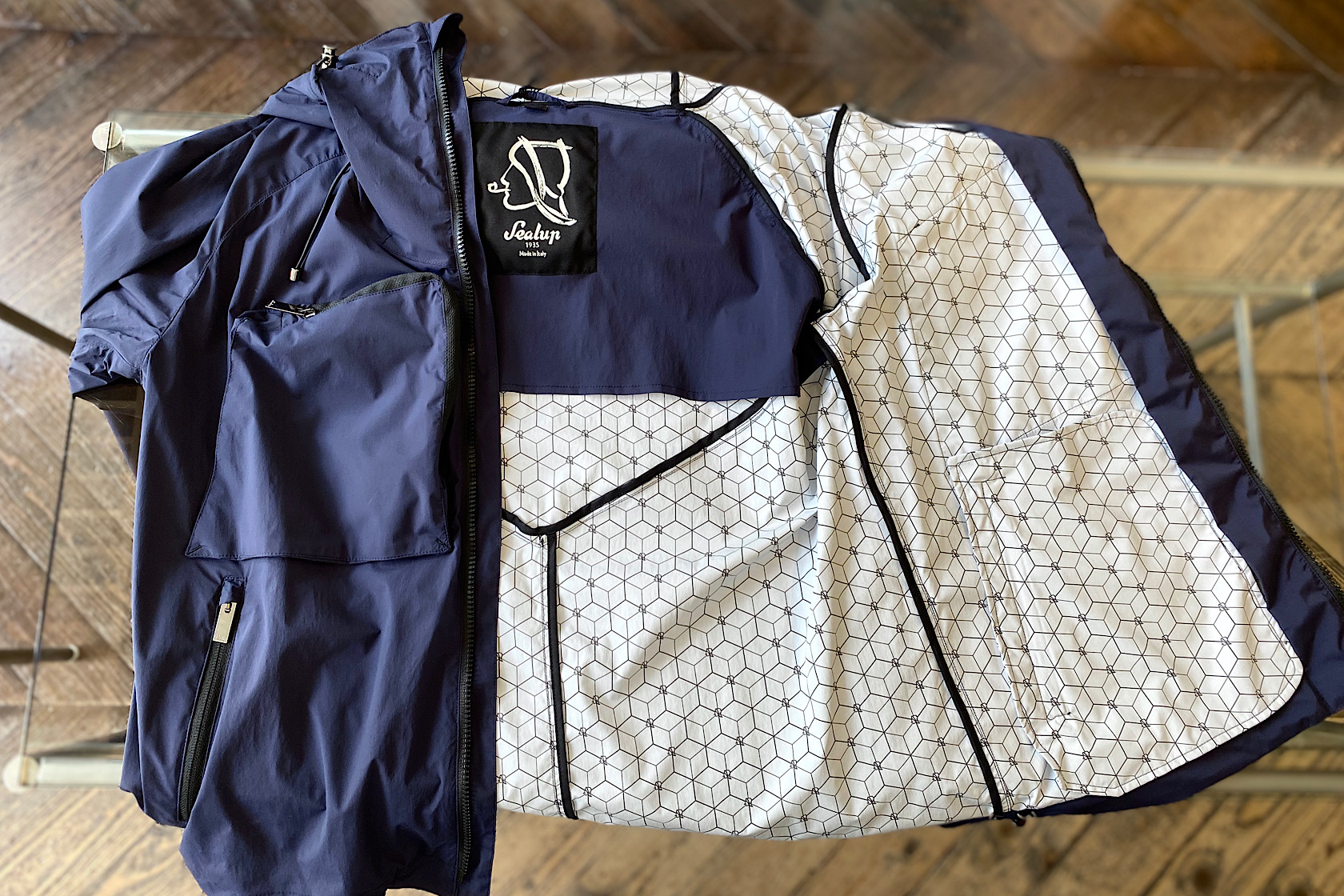 特徴的な裏地はポリウレタンに炭素元素を成分とするハニカム構造のシート状物質「グラフェン」をプリント加工したもの。チラリと見えるデザインがさり気ないアクセントになりますね。表地は上品な光沢感がエレガントなムード溢れるナイロン×ポリウレタン素材。やや薄手で軽快な着心地、もちろん撥水性も兼ね備えているので気温差のある季節の変わり目やこれから迎える梅雨のシーズンにも非常にオススメ。