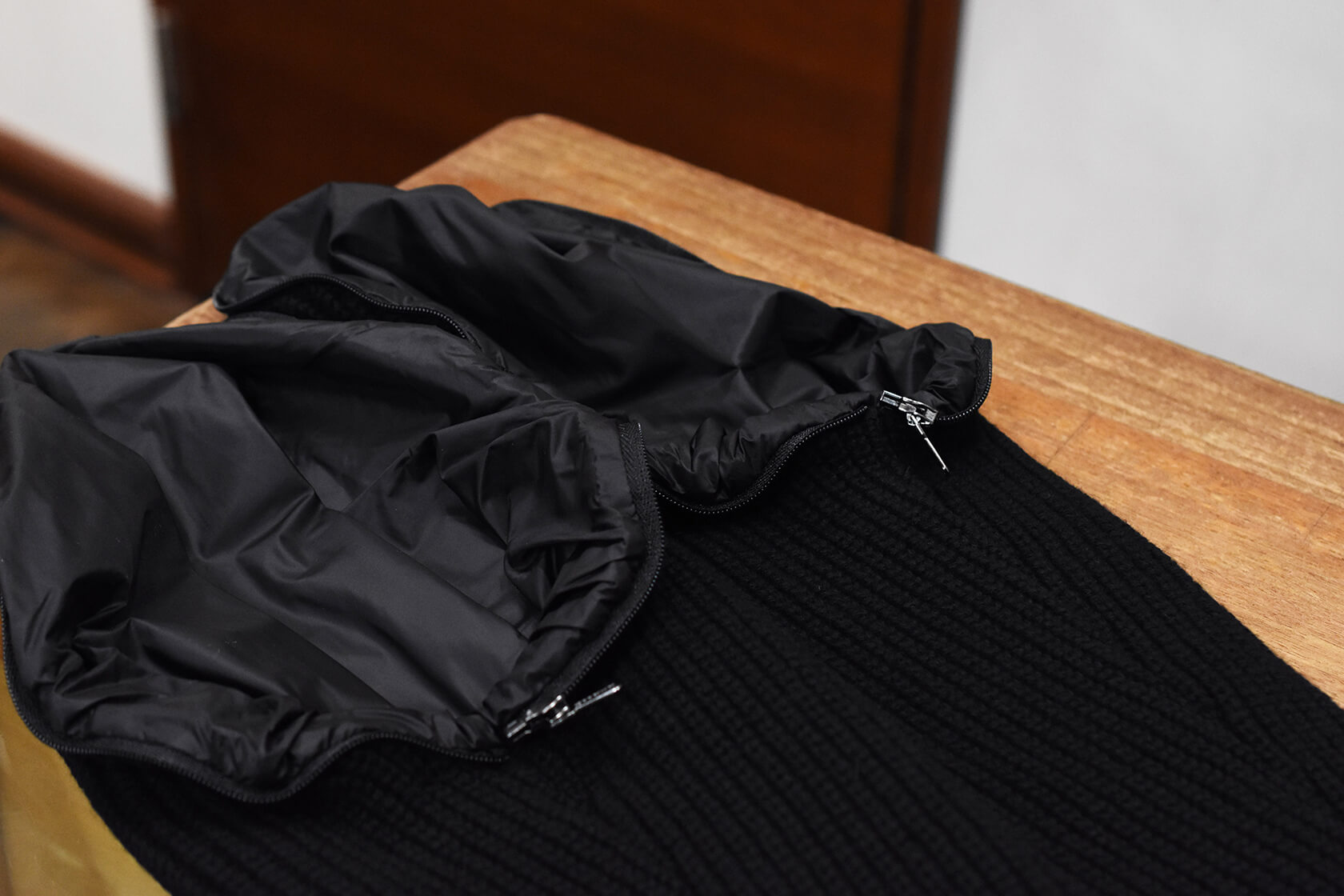 ニットスリーブはカシミアが10%含まれています。ダウンの品質に加えてこのスリーブもラグジュアリーですね。これによって柔らかなタッチで保温性もあります。 さらに裏地が取り付けられていますので袖通しもよく、風は通しにくい作りです。(ムーレーさん流石です。。)